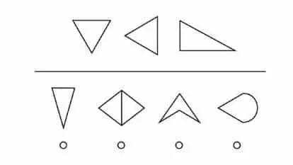 Take a look at the top two images. In some manner, they are linked. Now look at the form in the bottom left box and figure out which answer corresponds with it to produce the same shape relationship as the top two boxes.
